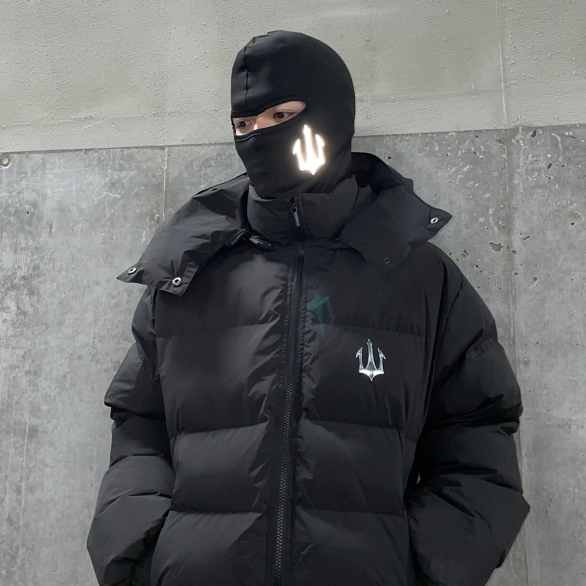 トライデントロゴが特徴的なOG REFLECTIVE LOGO BALACLAVA。フラッシュ撮影でロゴが光ります。